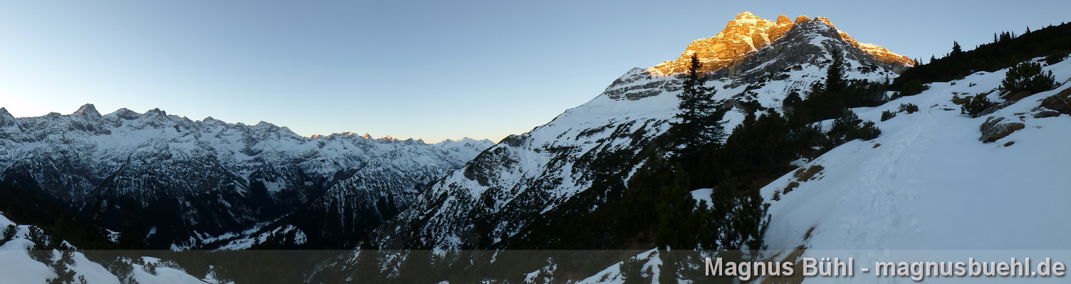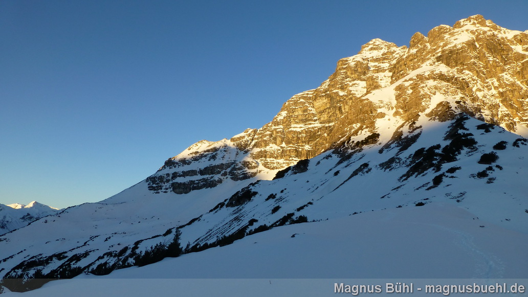 Der Hochvogel im Hornbachtal ist kein klassischer Winterberg. Doch dieser Januar ist einfach zu schneearm und mild. Nach einem kleinen Facebook-Chat über die Möglicheiten der nächsten Tage, war die Idee bei mir eingepflanzt. Nachdem ich dieses Jahr schon auf der Roten Flüh, dem Einstein, Aggenstein und dem Brentenjoch mit Wanderschuhen war, wollte ich sehen: „Was geht am Hochvogel?“