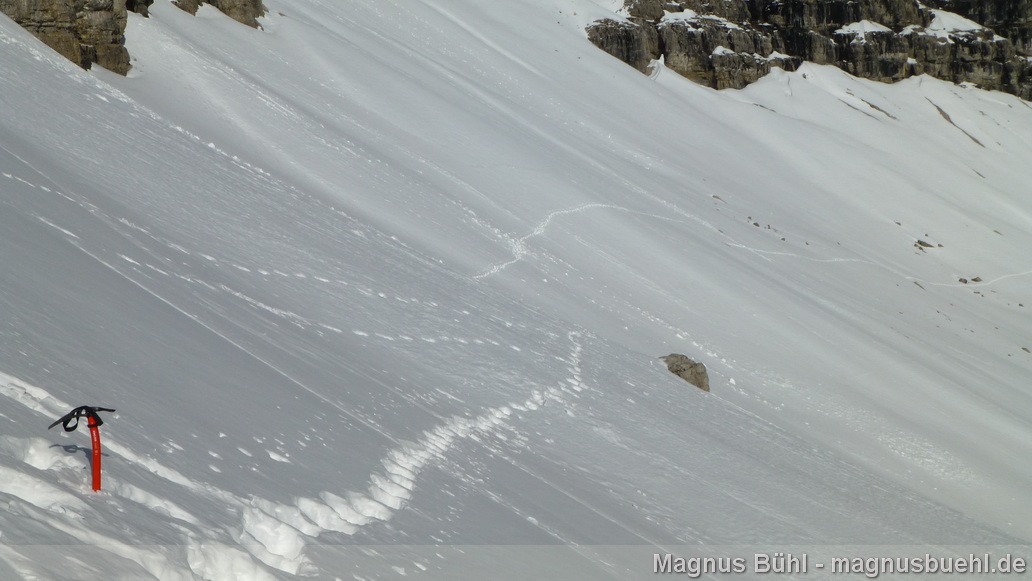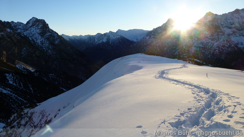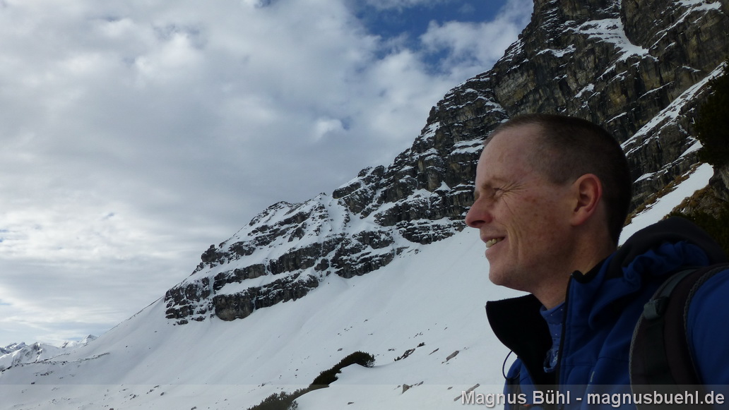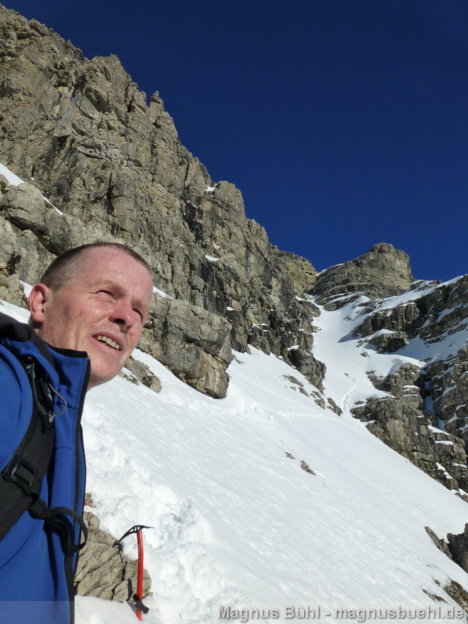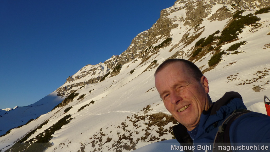 Die langgezogene Wanne zur Südwest-Schulter des Hochvogel ist trotz der Schneehöhe von mehr als einem halben Meter gut zu gehen. Erst der Aufstieg zu eigentlichen Einstieg des Bäumenheimer Wegs ist schweißtreibend.