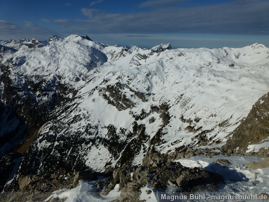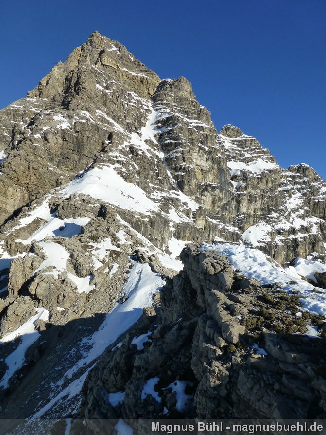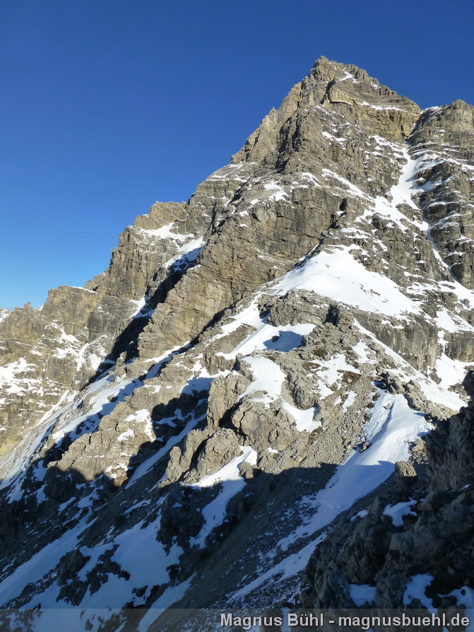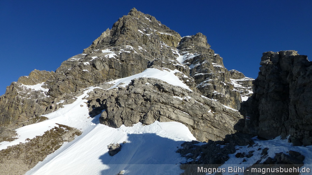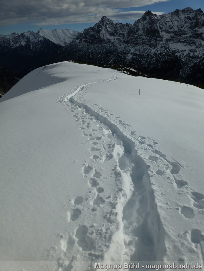 Hier beginnt Schneekraxelei. Es ist nicht ratsam dem Sommerweg direkt zu folgen. Den steilen Südosthang umgehe ich auf den Grat, was aber einen kleine I-IIer Kletterei nötig macht. Die Spuren meiner Vorgänger sind immer wieder zu finden.