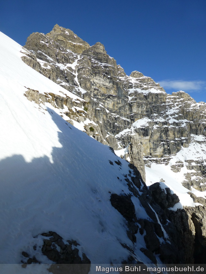 Ich steige nach links zum Bäumenheimer Weg. Ein kleiner Umweg, jetzt schon mit Steigeisen ist nötig, das der Sommerweg durch einen Tobel führt, der jetzt zu gefährlich wäre. Die Schneedecke ist beinhart gefroren. Diese steilen Hangquerungen sind nur mit Steigeisen ohne Adrenalin zu gehen. Ein Ausrutscher würde fatale Folgen haben, mindestens eine lange Rutschfahrt ins Ungewisse.