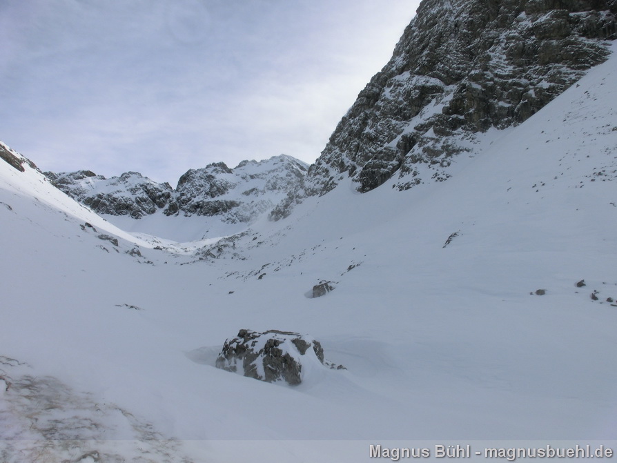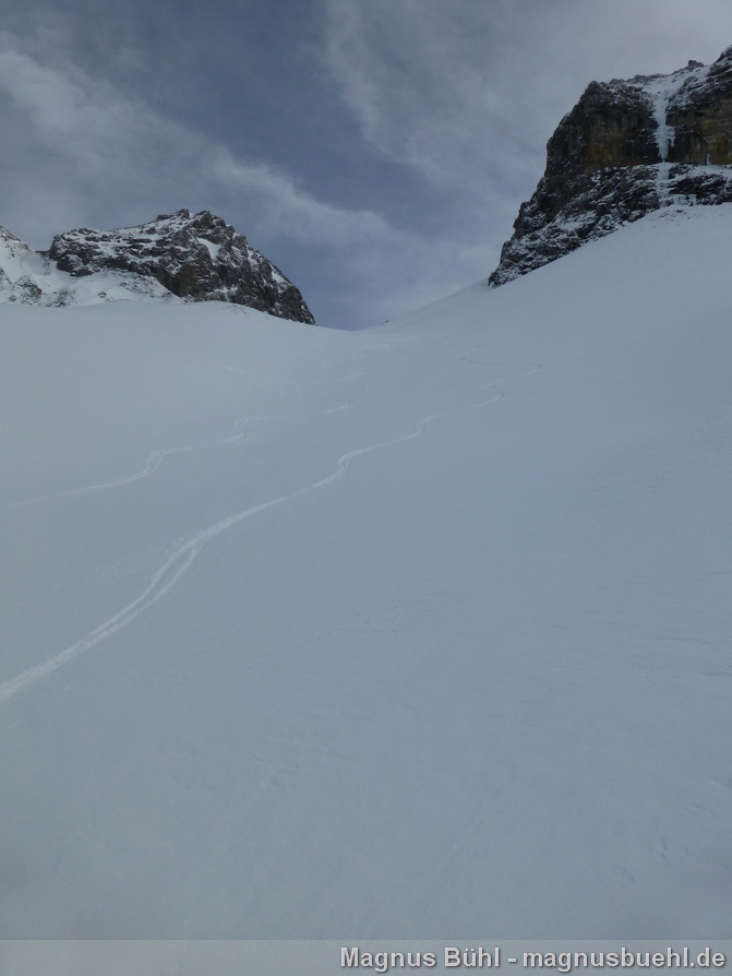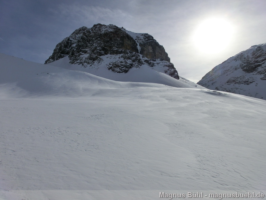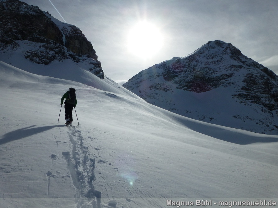 Die Schlüsselstelle ist die Querung nach rechts hinüber unterhalb des Mußkopfs. Die Neuschneeauflage liegt auf einem teils verblasenen Harschdeckel. Hier lassen wir der Sicherheit den Vortritt und ziehen die Ski aus. Einzeln mit Pickel als Sicherung und Ski am Rucksack queren wir die mit 45-50 Grad steilste Stelle. Ich bin froh zu zweit zu sein, denn alleine hätte ich hier sicher einen Rückzieher gemacht.