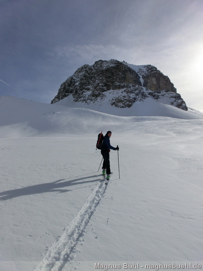 Genug geträumt – im Bergschatten und Wind machen wir unsere Ski abfahrtsbereit. Gleich auf den ersten Metern übersehe ich eine Welle und leiste mir den Sturz des Tages. Ein blauer Fleck wird mich ein paar Tage daran erinnern.