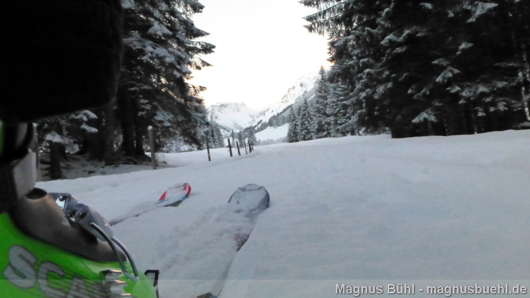 Um etwa 05:20 standen Heiko und ich am Fellhornparkplatz hinter Oberstdorf. Unsere Hoffnung, dass ab hier noch genügend Schnee im Talboden für den Aufstieg durchs Rappenalptal lag wurde bestätigt. Der Regen der Nacht und das anschließende Aufklaren hatte die dünne Altschneedecke durchfrieren lassen. Mit unseren Stirnlampen bewaffnet machten wir uns auf.