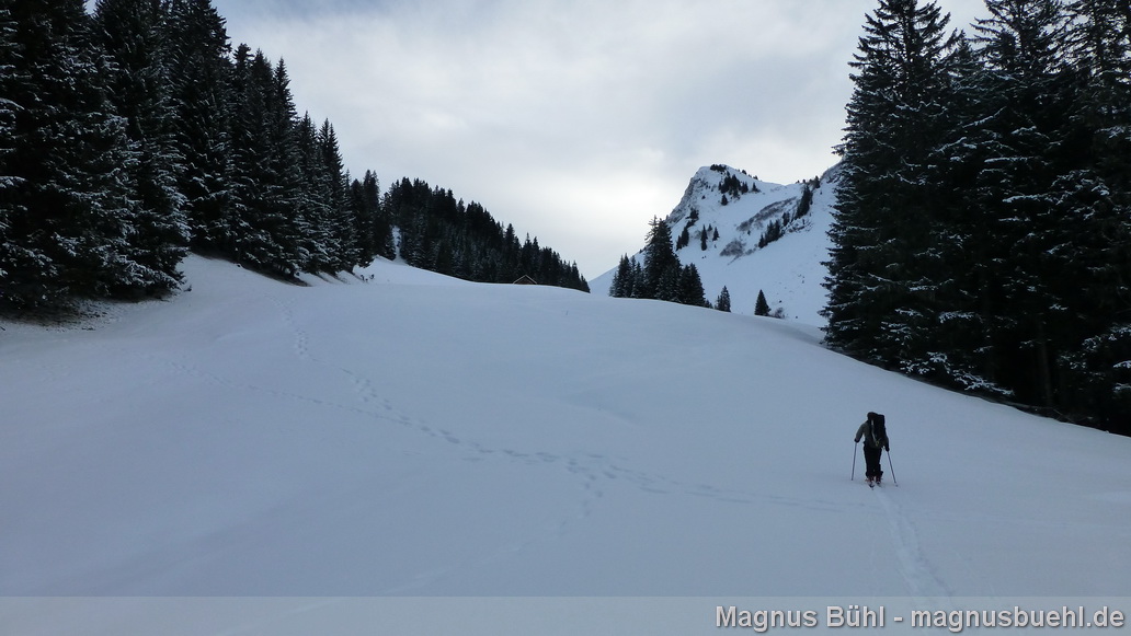 Als wir eine Höhe von etwa 1.500 m erreichen ist nun doch über eine Nacht etwa 10 cm Neuschnee gefallen. Das Gelände wird freier. Wir passieren die Mittlere Rappenalpe – so langsam sieht es nach Winter aus.