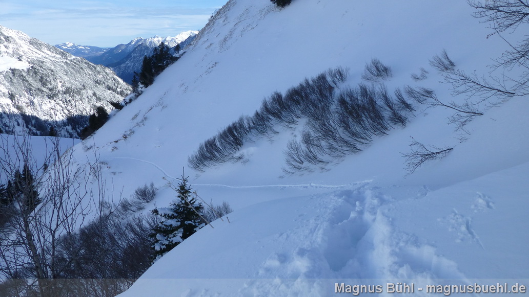 Noch einmal heißt es aufpassen. Die Querung unterhalb des Mußkopfs fühlt sich jetzt leichter an. Trotzdem ziehen wir auf den steilsten 20 m Querung wieder die Ski aus.