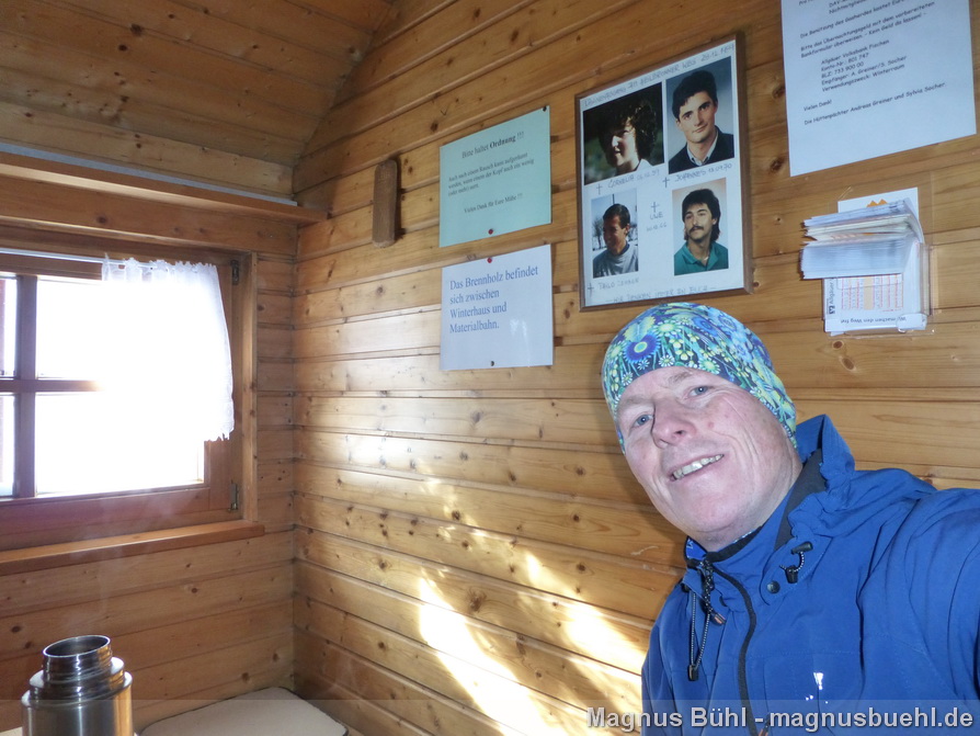 Die Rappenseehütte präsentiert sich in gleisendem Sonnenlicht. Trotz des schneearmen Winters im Allgäu sind ihre Türen und Fenster im Erdgeschoss durch eine dicke Schneeschicht nicht zugänglich. Wir statten dem sehr komfortabelen und gut ausgestatteten Winterraum im Obergeschoss des Nebengebäudes für unsere Mittagsrast einen Besuch ab. Dieses Jahr sind wir laut Hüttenbuch die zweiten Besucher des Winterraums. Es wundert mich, dass es in diesem Jahr noch kaum einer bis hier herauf gewagt hat.