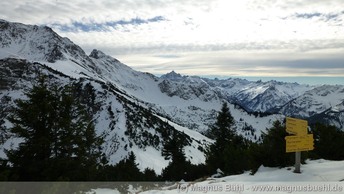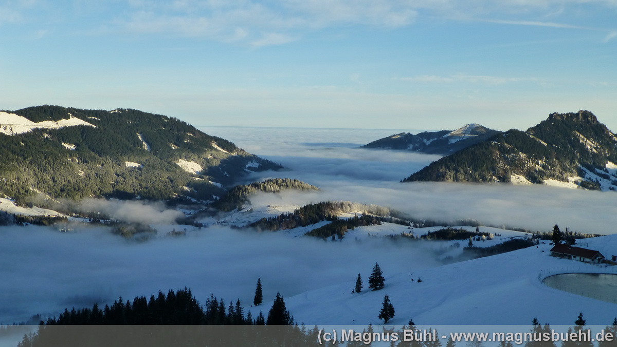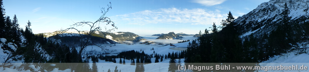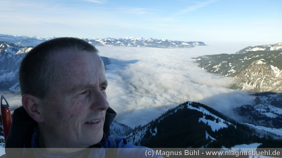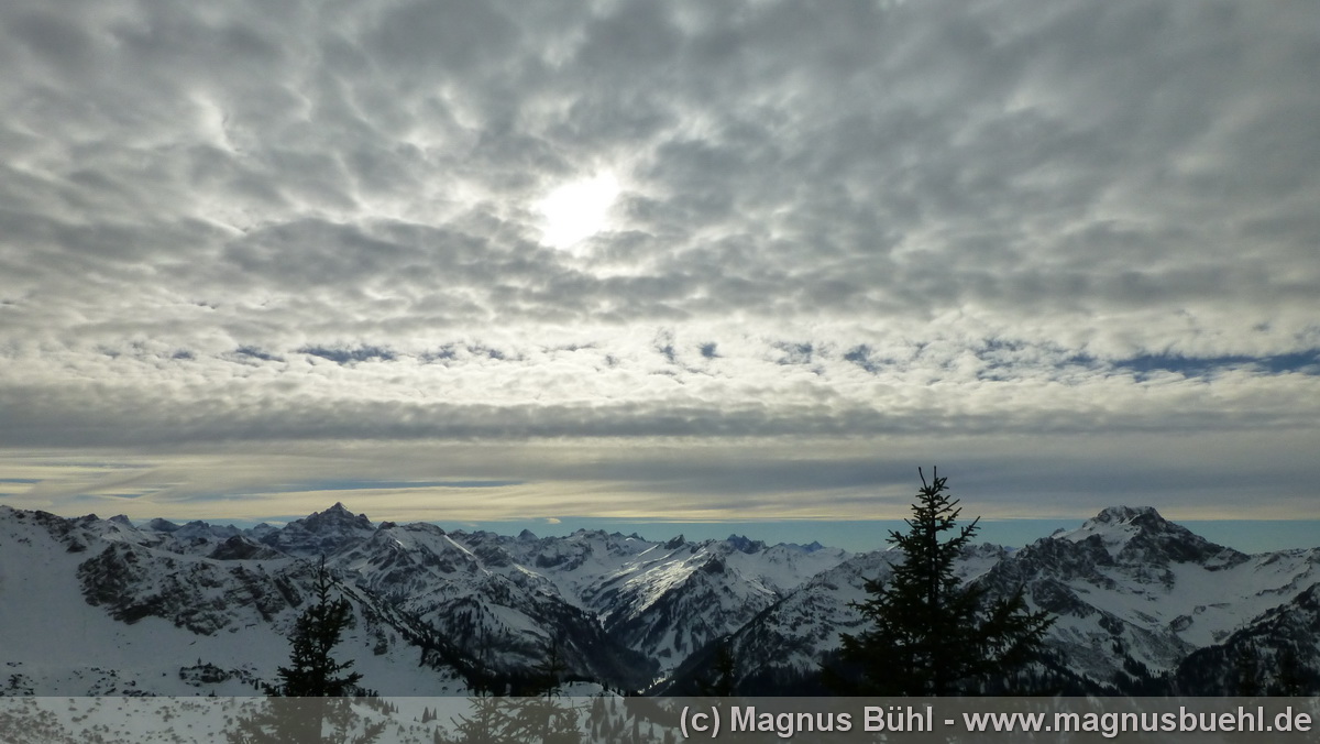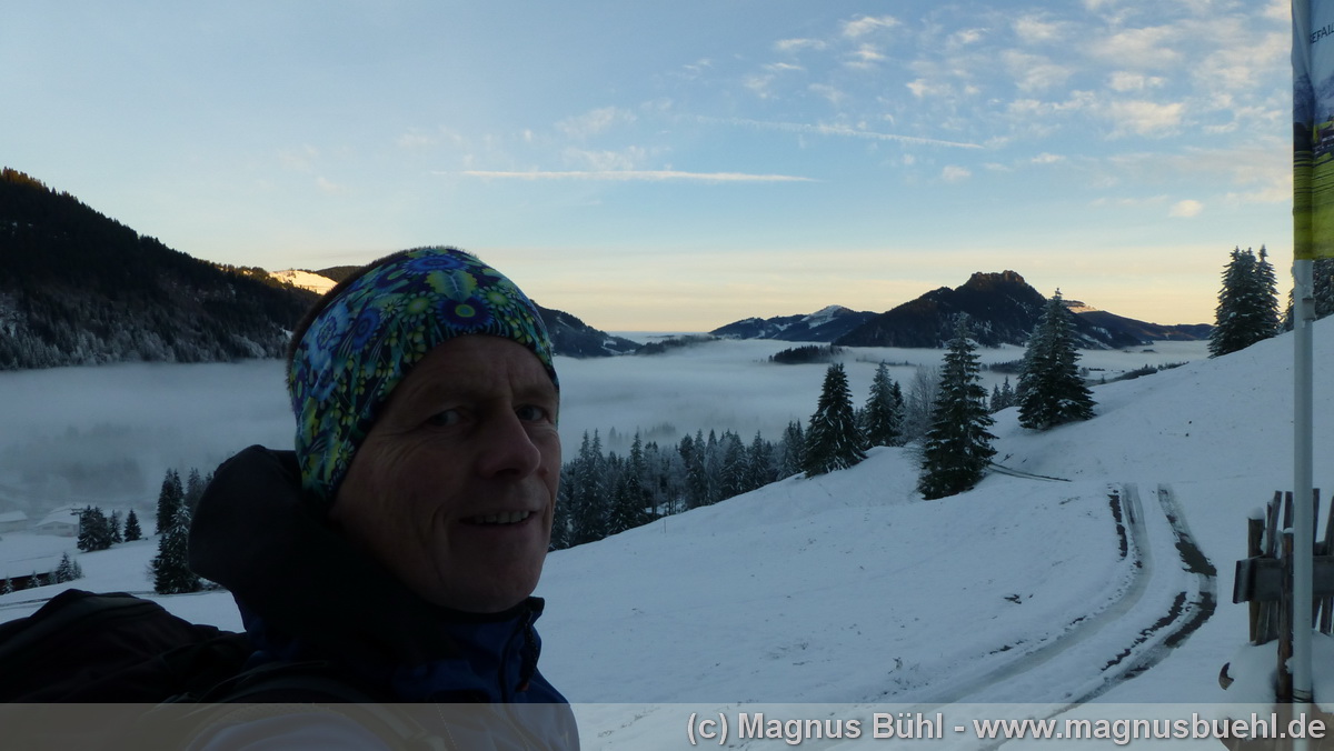 Seit Tagen hängt eine fette Nebeldecke über uns, doch der Wetterbericht verspricht oberhalb Sonne. Um 06:20 starte ich in Richtung Süden. Auf dem kleinen Parkplatz vor Oberjoch stelle ich mein Auto an. Start um 07:10. Der letzte Kilometer hinauf nach Oberjoch zeigt erstmals ein Aufreißen der Nebeldecke. Darüber herrliches Frühwinterwetter.