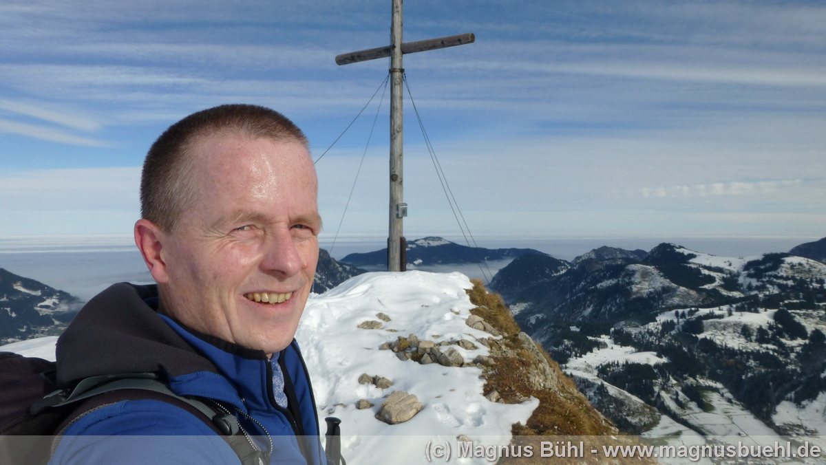 Bis auf den Iseler Gipfel brauche ich fast 1 1/2 Stunden. Das liegt aber mehr an den vielen Fotopausen. Das Gipfel-Panorama oberhalb des herbstlichen Nebelmeers ist einfach zu schön. Nach einer längeren Gipfelrast auf dem Iseler stapfe ich weiter in Richtung Kühgundkopf und Wannenjoch.