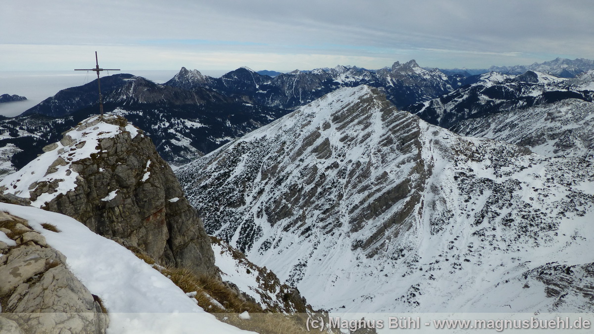 Hier hoch treffe ich auch auf unerwartete Begleitung. Von der Zipfelsalpe her kommen mehrere Wanderer (mit Schneeschuhen auf dem Rücken) hinauf zum Bschiesser. Am Gipfel sind wir dann zu Sechst. Hätte ich nicht erwartet bei dieser Schneelage so viele Menschen zu treffen.